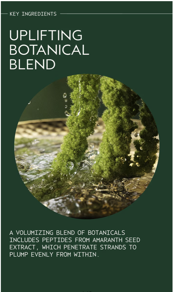 Found in our botanical volumizing blend and distilled to the size of a peptide to ensure efficacy. Evenly plumps hair and reduces surface friction for enhanced volume with natural movement.